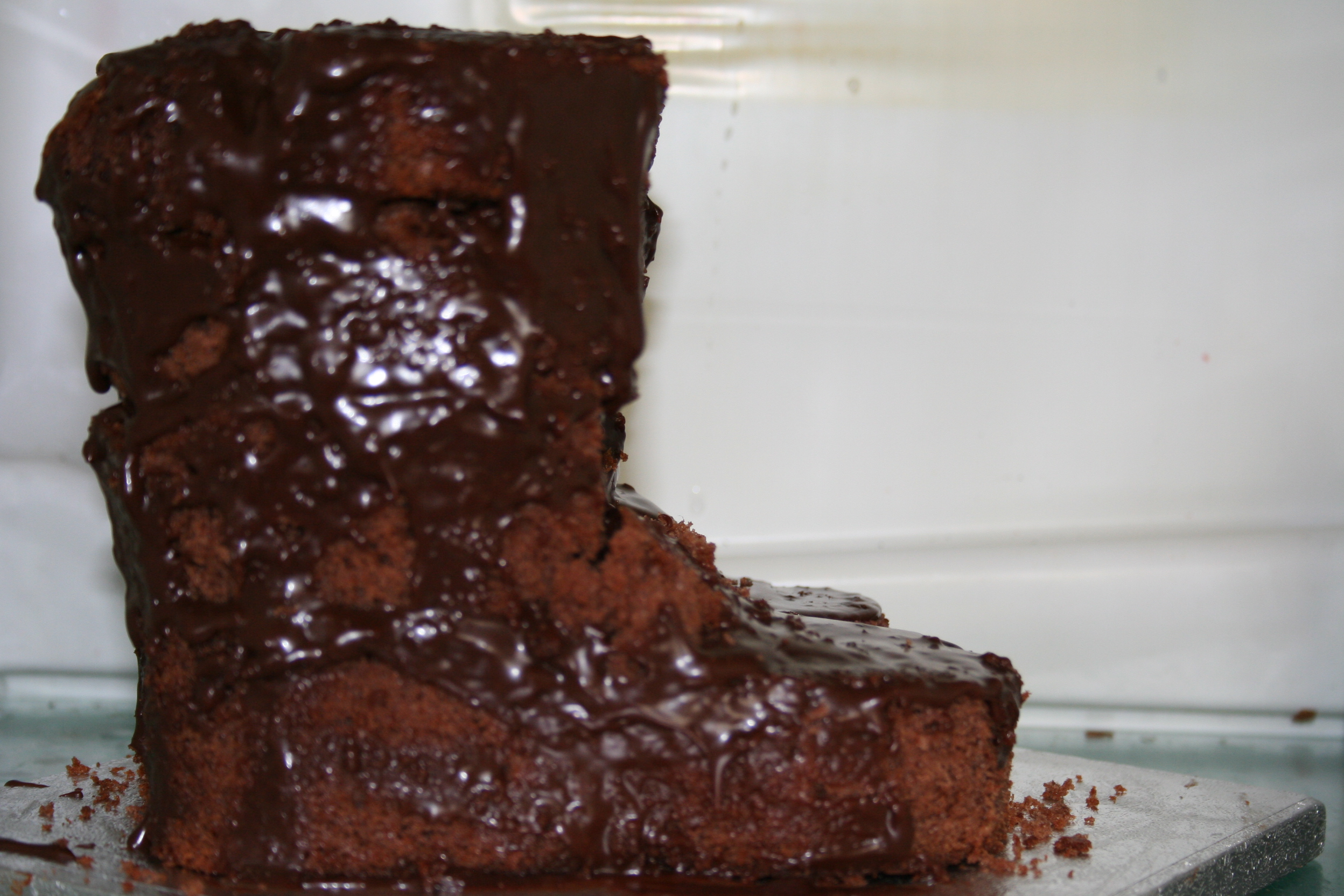 The cut-outs were used to cut the base and the leg of the wellies from two 7 inch square cakes. A slightly thicker one was used for the base as this had to support the weight of the legs. The smaller bits (legs and wedges were cut from the other one. In all, I had 3 layers for the legs + 1 layer for the base.