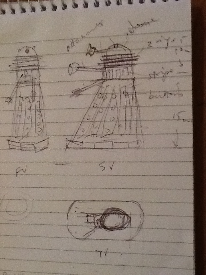 The overall structure and shape of the Dalek is not very conventional. After a lot of research on the internet, I had figured out what it should look like. But to get to a point where I could create a paper stencil of the overall shape, I had to put my engineering drawing skills to good use!