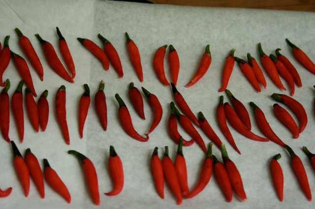 The first one will have red chillies made from marzipan (see photo). All of these have been hand rolled and painted.