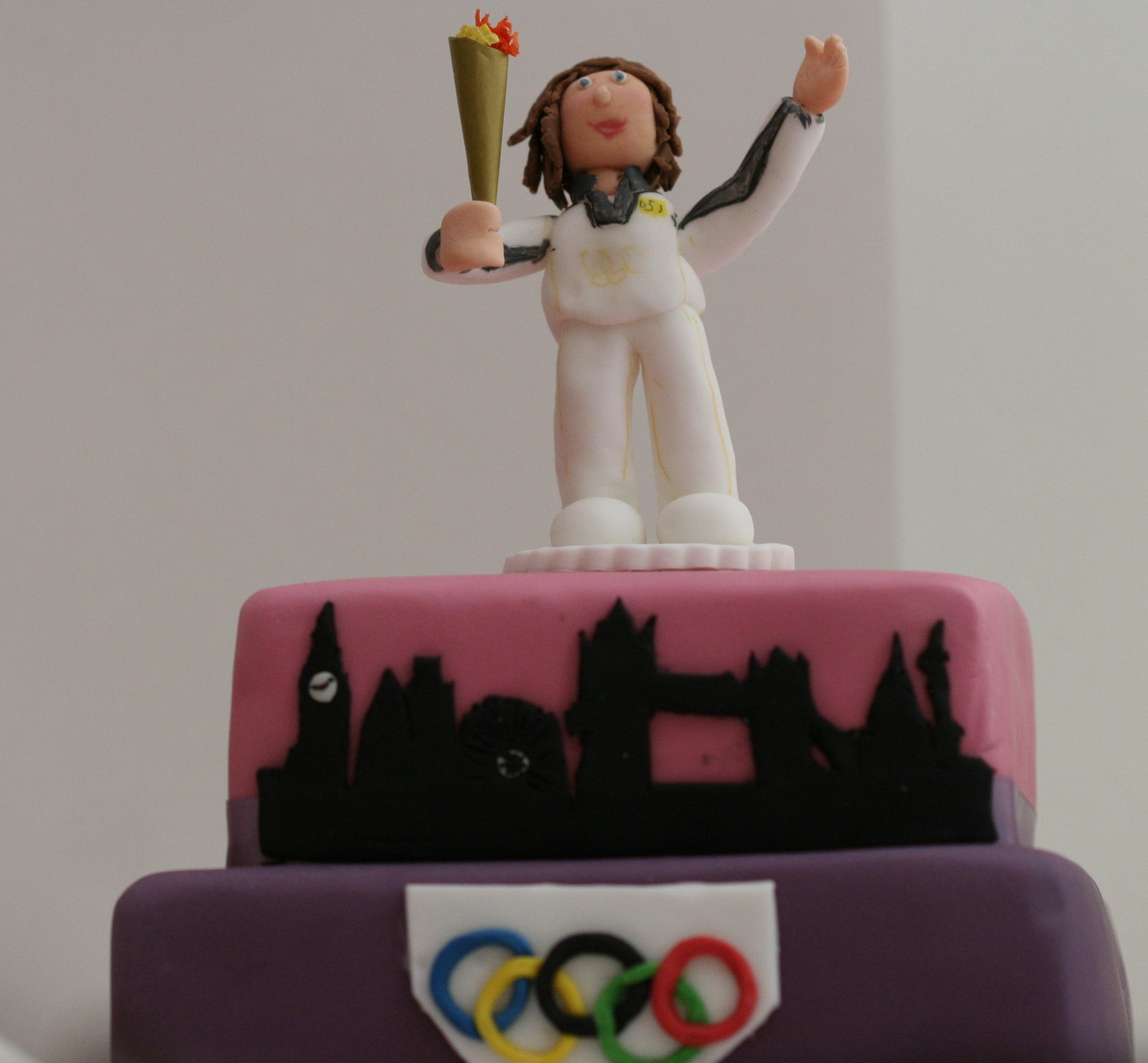The cake was a rich chocolate cake with dark chocolate ganache. The sugar figure was made keeping her torchbearer uniform. The colours used can easily be identified as the ones seen in the venues, tickets and signboards of the 2012 Olympics. The London skyline was widely used at the venues and TV coverage, so I decided to throw in an icing silhouette of the same.