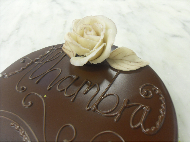 Hazelnut chocolate sponge with chocolate glaze and marzipan rose